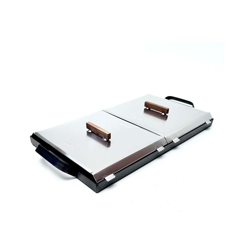 La Planchetta para 2 hornallas con tapas es un equipamiento de cocina profesional para uso doméstico. Puede ser utilizada sobre cualquier tipo de calor (hornalla, cocina eléctrica, carbón, fuego,etc.). Cociná de un modo simple, rápido y económico.